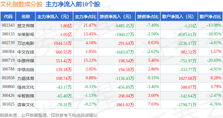 资金流向方面,文化指数(399248)成份股当日主力资金净流出合计956.89万元,游资资金净流入合计3414.71万元,散户资金净流出合计2457.82万元。成份股资金流向详情见下表: