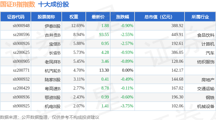 国证B指(399318)指数十大成份股详情如下: