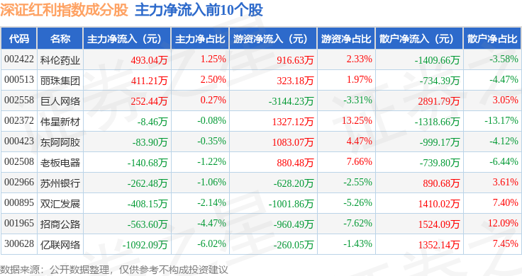 资金流向方面,深证红利(399324)指数成份股当日主力资金净流出合计36.41亿元,游资资金净流入合计11.18亿元,散户资金净流入合计25.23亿元。成份股资金流向详情见下表: