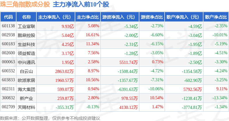 资金流向方面,珠三角(399356)指数成份股当日主力资金净流出合计5.88亿元,游资资金净流出合计2.65亿元,散户资金净流入合计8.53亿元。成份股资金流向详情见下表: