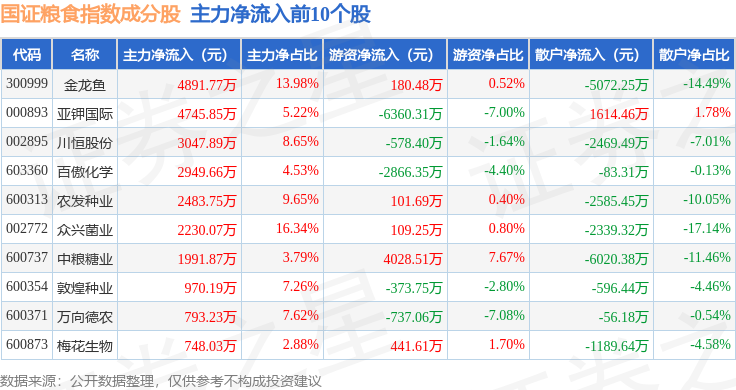 资金流向方面,国证粮食(399365)指数成份股当日主力资金净流出合计10.92亿元,游资资金净流入合计3.32亿元,散户资金净流入合计7.6亿元。成份股资金流向详情见下表: