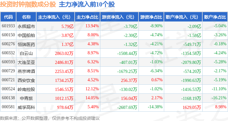 资金流向方面,投资时钟(399391)指数成份股当日主力资金净流出合计65.99亿元,游资资金净流入合计23.56亿元,散户资金净流入合计42.43亿元。成份股资金流向详情见下表: