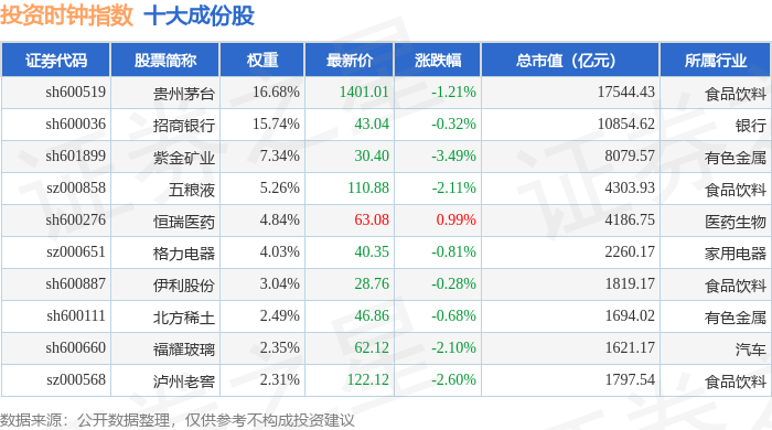 证券之星消息,12月9日,投资时钟(399391)指数报收于3310.21点,跌1.35%,成交795.36亿元,换手率0.92%。当日该指数成份股中,上涨的有12家,永辉超市以9.95%的涨幅领涨,下跌的有87家,江西铜业以6.06%的跌幅领跌。