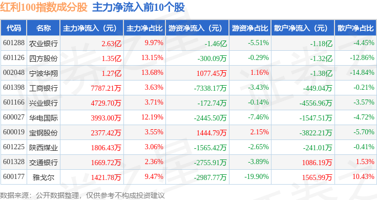 资金流向方面,红利100(399411)指数成份股当日主力资金净流出合计11.76亿元,游资资金净流入合计3.65亿元,散户资金净流入合计8.11亿元。成份股资金流向详情见下表: