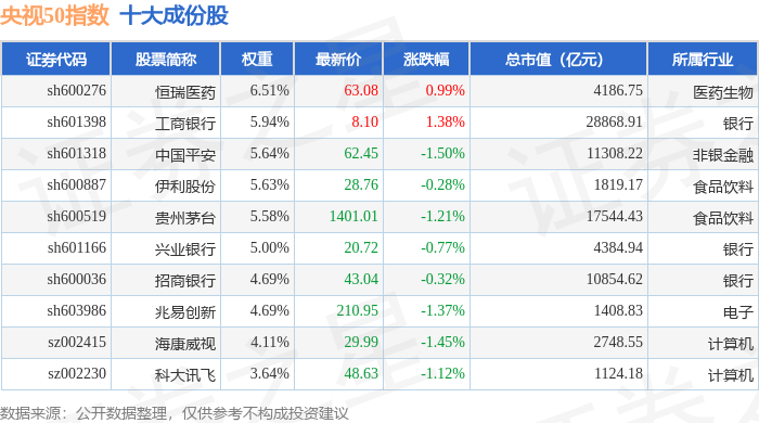 证券之星消息,12月9日,央视50(399550)指数报收于7942.06点,跌0.75%,成交503.04亿元,换手率0.3%。当日该指数成份股中,上涨的有8家,双鹭药业以2.73%的涨幅领涨,下跌的有41家,万科A以2.85%的跌幅领跌。