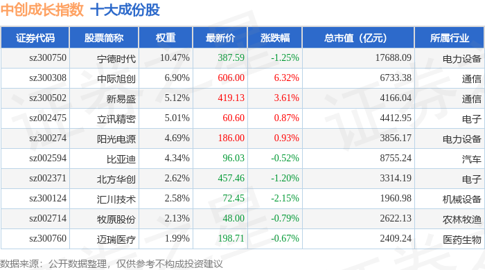 资金流向方面,中创成长(399626)指数成份股当日主力资金净流出合计60.28亿元,游资资金净流入合计7.5亿元,散户资金净流入合计52.78亿元。成份股资金流向详情见下表: