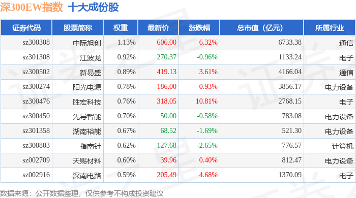 证券之星消息,12月9日,深300EW(399633)指数报收于6045.0点,跌0.66%,成交3731.78亿元,换手率1.31%。当日该指数成份股中,上涨的有62家,胜宏科技以10.81%的涨幅领涨,下跌的有232家,科达利以7.09%的跌幅领跌。