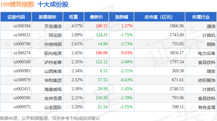 100绩效(399656)指数十大成份股详情如下: