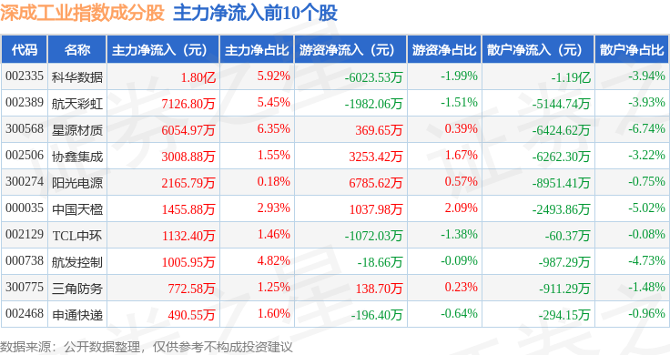 资金流向方面,深成工业(399682)指数成份股当日主力资金净流出合计54.93亿元,游资资金净流入合计11.23亿元,散户资金净流入合计43.7亿元。成份股资金流向详情见下表: