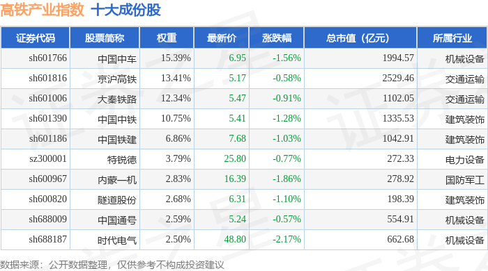 资金流向方面,高铁产业(399807)指数成份股当日主力资金净流出合计6.2亿元,游资资金净流入合计2.41亿元,散户资金净流入合计3.79亿元。成份股资金流向详情见下表: