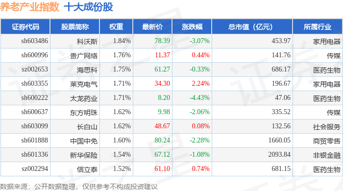 养老产业(399812)指数十大成份股详情如下: