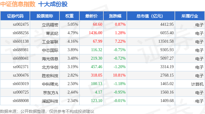 证券之星消息,12月9日,中证信息(399935)指数报收于6380.58点,涨0.53%,成交2353.53亿元,换手率2.08%。当日该指数成份股中,上涨的有44家,胜宏科技以10.81%的涨幅领涨,下跌的有83家,中科飞测以3.92%的跌幅领跌。