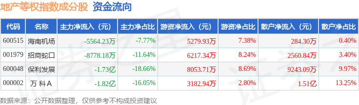 资金流向方面,地产等权(399983)指数成份股当日主力资金净流出合计4.99亿元,游资资金净流入合计2.27亿元,散户资金净流入合计2.71亿元。成份股资金流向详情见下表: