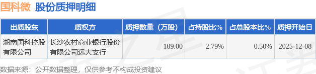 证券之星消息,国科微(300672)12月9日公开信息显示,股东湖南国科控股有限公司向长沙农村商业银行股份有限公司远大支行合计质押109.0万股,占总股本0.5%。质押详情见下表: