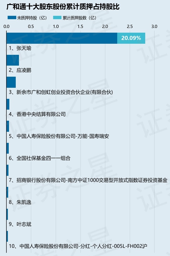 截止本公告日,股东张天瑜已累计质押股份5656.93万股,占其持股总数的20.09%。本次质押后广和通十大股东的累计质押股份占持股比例(占持股比例的计算以公司最新一期财务报表公布的十大股东的持股总数为基准)见下图: