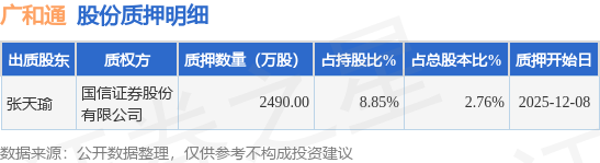 证券之星消息,广和通(300638)12月9日公开信息显示,股东张天瑜向国信证券股份有限公司合计质押2490.0万股,占总股本2.76%。质押详情见下表: