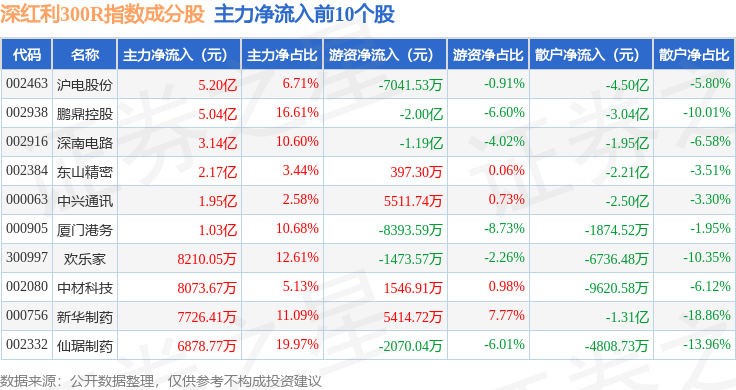 资金流向方面,深红利300R(470062)指数成份股当日主力资金净流出合计83.87亿元,游资资金净流入合计22.02亿元,散户资金净流入合计61.85亿元。成份股资金流向详情见下表: