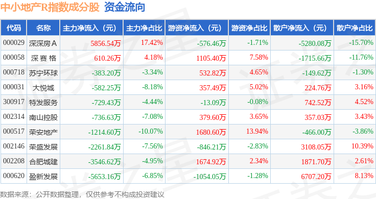 资金流向方面,中小地产R(471002)指数成份股当日主力资金净流出合计8640.93万元,游资资金净流入合计3241.03万元,散户资金净流入合计5399.9万元。成份股资金流向详情见下表: