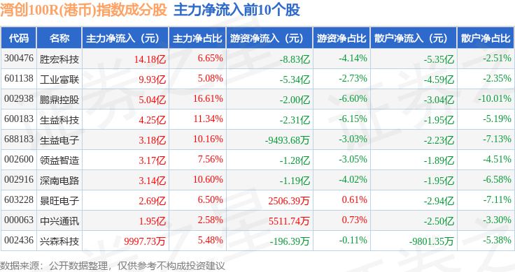 资金流向方面,湾创100R(港币)(480002)指数成份股当日主力资金净流入合计3.9亿元,游资资金净流出合计10.99亿元,散户资金净流入合计7.09亿元。成份股资金流向详情见下表: