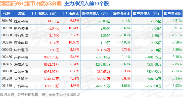 资金流向方面,湾区新兴R(港币)(480008)指数成份股当日主力资金净流出合计17.6亿元,游资资金净流出合计2.41亿元,散户资金净流入合计20.01亿元。成份股资金流向详情见下表: