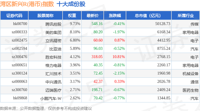 湾区新兴R(港币)(480008)指数十大成份股详情如下: