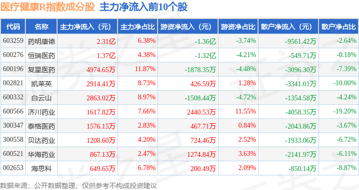 资金流向方面,医疗健康R(480016)指数成份股当日主力资金净流出合计2.91亿元,游资资金净流入合计2.15亿元,散户资金净流入合计7570.3万元。成份股资金流向详情见下表: