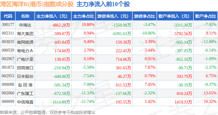 资金流向方面,湾区海洋R(港币)(480020)指数成份股当日主力资金净流出合计6985.22万元,游资资金净流出合计4850.41万元,散户资金净流入合计1.18亿元。成份股资金流向详情见下表: