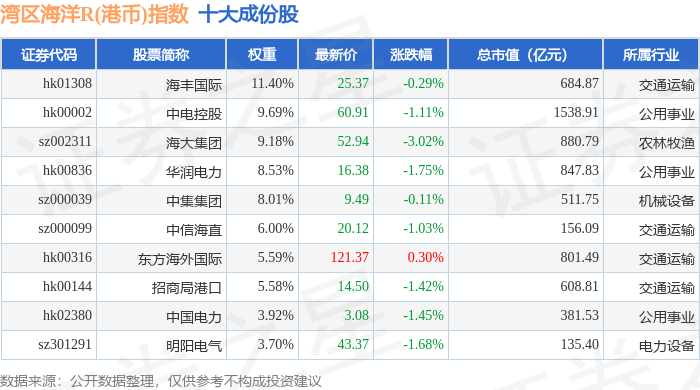 湾区海洋R(港币)(480020)指数十大成份股详情如下: