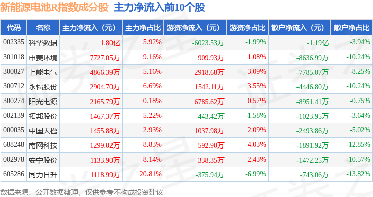 资金流向方面,新能源电池R(480027)指数成份股当日主力资金净流出合计11.0亿元,游资资金净流入合计3.56亿元,散户资金净流入合计7.44亿元。成份股资金流向详情见下表: