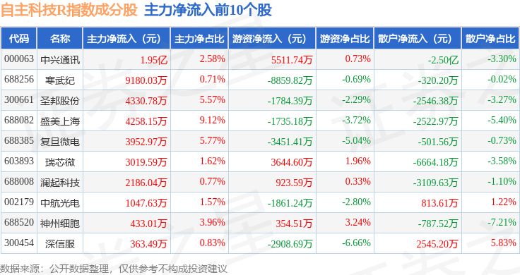 资金流向方面,自主科技R(480033)指数成份股当日主力资金净流出合计26.8亿元,游资资金净流入合计12.75亿元,散户资金净流入合计14.05亿元。成份股资金流向详情见下表:
