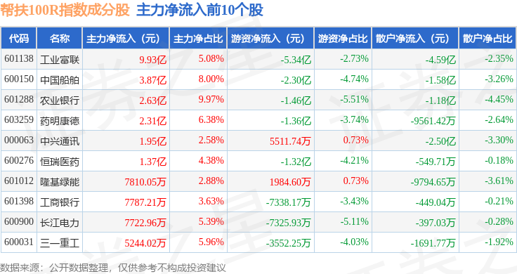 资金流向方面,帮扶100R(480065)指数成份股当日主力资金净流出合计92.62亿元,游资资金净流入合计29.86亿元,散户资金净流入合计62.76亿元。成份股资金流向详情见下表: