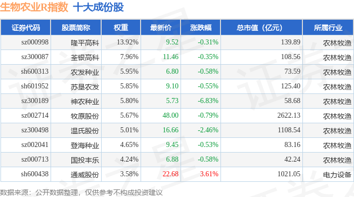 近10日内生物农业R(480072)指数成份股做了调整,新纳入了7只股票。