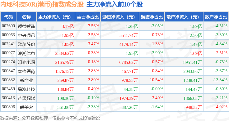 资金流向方面,内地科技50R(港币)(483004)指数成份股当日主力资金净流出合计14.6亿元,游资资金净流入合计2.78亿元,散户资金净流入合计11.83亿元。成份股资金流向详情见下表: