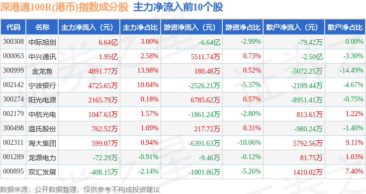 资金流向方面,深港通100R(港币)(483008)指数成份股当日主力资金净流出合计53.71亿元,游资资金净流入合计8.33亿元,散户资金净流入合计45.38亿元。成份股资金流向详情见下表: