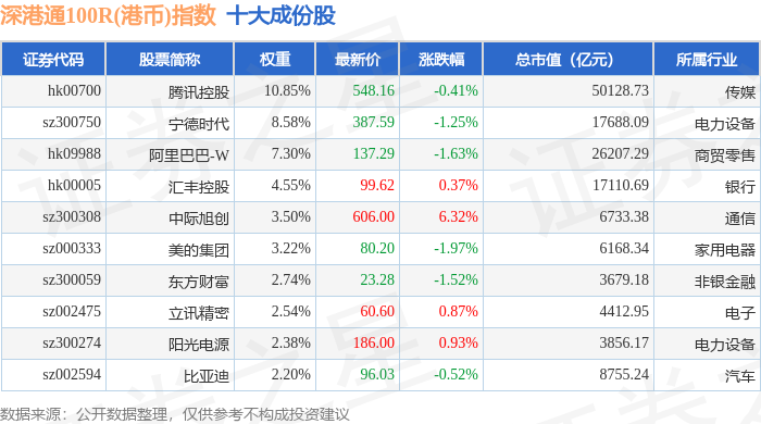 深港通100R(港币)(483008)指数十大成份股详情如下: