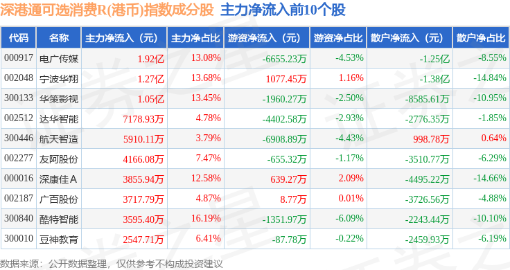 资金流向方面,深港通可选消费R(港币)(483020)指数成份股当日主力资金净流出合计57.73亿元,游资资金净流入合计7.45亿元,散户资金净流入合计50.27亿元。成份股资金流向详情见下表: