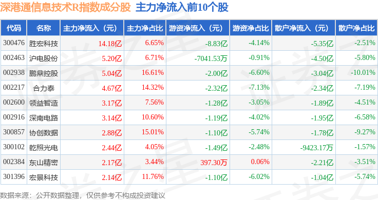 资金流向方面,深港通信息技术R(483027)指数成份股当日主力资金净流出合计36.32亿元,游资资金净流出合计11.03亿元,散户资金净流入合计47.34亿元。成份股资金流向详情见下表: