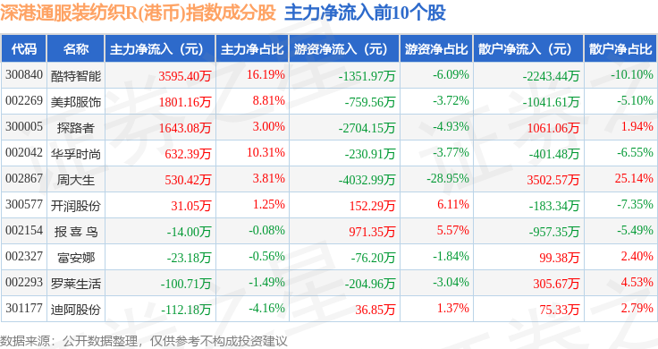 资金流向方面,深港通服装纺织R(港币)(483042)指数成份股当日主力资金净流出合计4645.92万元,游资资金净流出合计7389.76万元,散户资金净流入合计1.2亿元。成份股资金流向详情见下表: