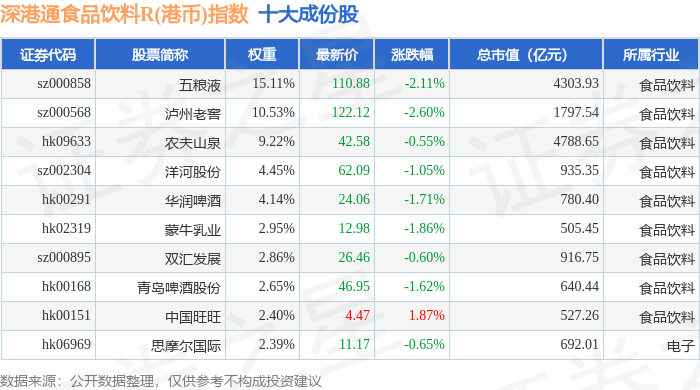 深港通食品饮料R(港币)(483066)指数十大成份股详情如下:
