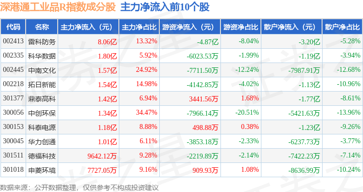 资金流向方面,深港通工业品R(483069)指数成份股当日主力资金净流出合计61.12亿元,游资资金净流入合计2.33亿元,散户资金净流入合计58.79亿元。成份股资金流向详情见下表: