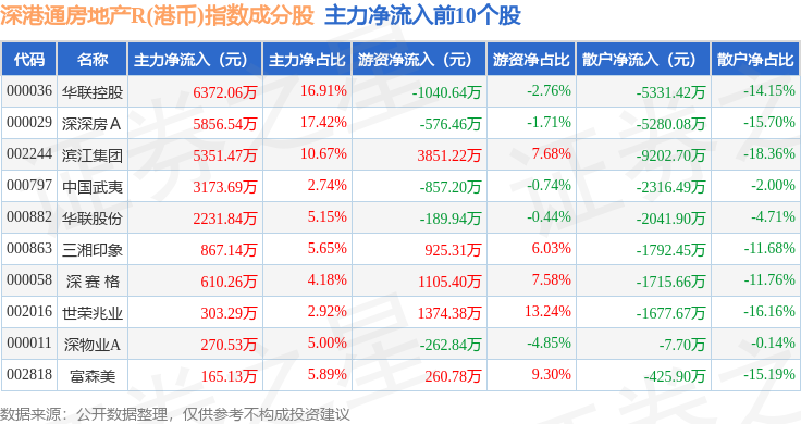 资金流向方面,深港通房地产R(港币)(483072)指数成份股当日主力资金净流出合计4.03亿元,游资资金净流入合计2.5亿元,散户资金净流入合计1.52亿元。成份股资金流向详情见下表: