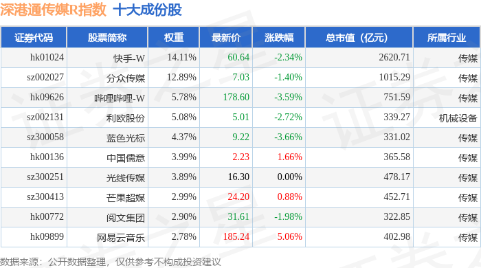 深港通传媒R(483075)指数十大成份股详情如下: