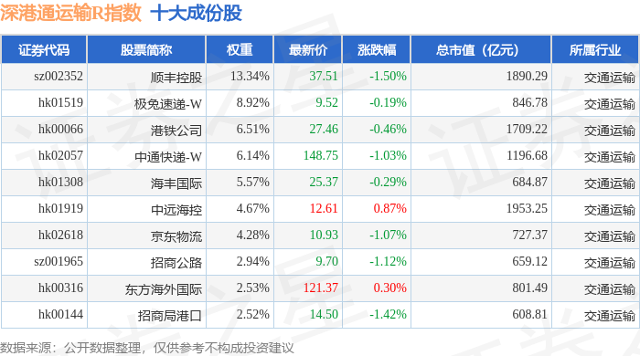 证券之星消息,12月9日,深港通运输R(483077)指数报收于6145.62点,跌1.07%,成交73.5亿元,换手率0.49%。当日该指数成份股中,上涨的有7家,厦门港务以10.0%的涨幅领涨,下跌的有50家,海峡股份以5.62%的跌幅领跌。