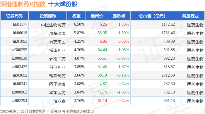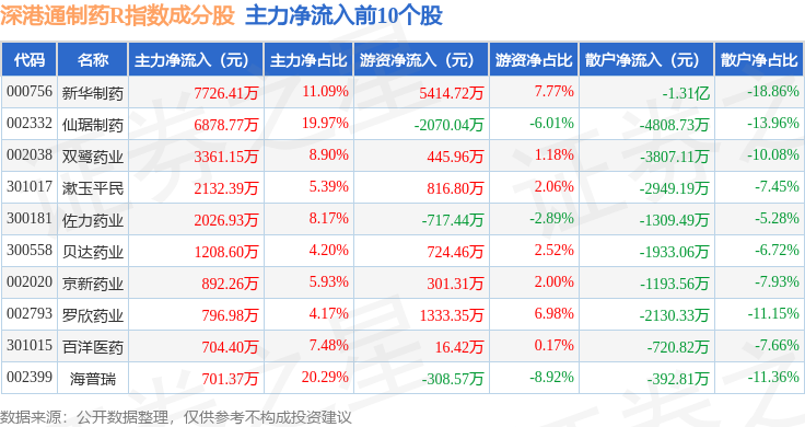 资金流向方面,深港通制药R(483079)指数成份股当日主力资金净流出合计12.11亿元,游资资金净流入合计2.17亿元,散户资金净流入合计9.94亿元。成份股资金流向详情见下表: