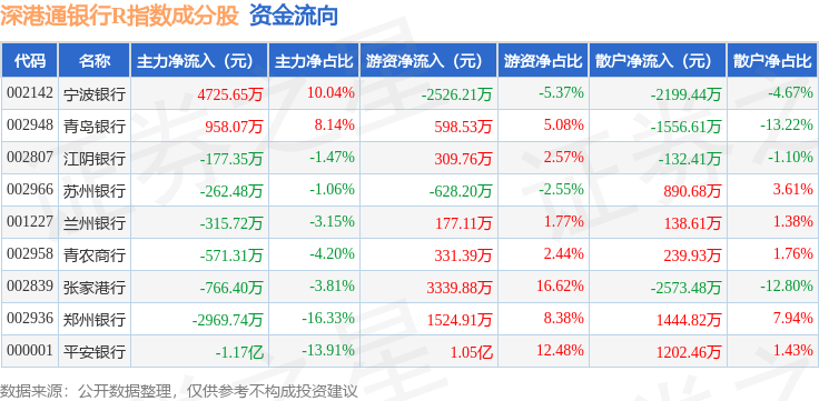 资金流向方面,深港通银行R(483081)指数成份股当日主力资金净流出合计1.11亿元,游资资金净流入合计1.36亿元,散户资金净流出合计2545.44万元。成份股资金流向详情见下表: