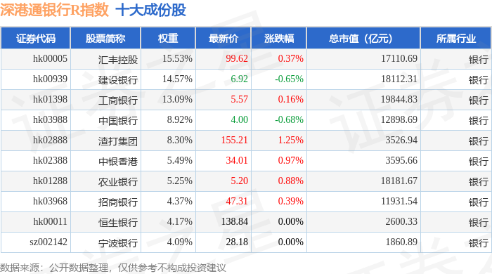 证券之星消息,12月9日,深港通银行R(483081)指数报收于12308.44点,跌0.04%,成交86.51亿元,换手率0.19%。当日该指数成份股中,上涨的有9家,渣打集团以1.25%的涨幅领涨,下跌的有19家,大新银行集团以1.65%的跌幅领跌。