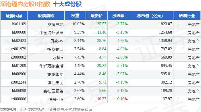 证券之星消息,12月9日,深港通内房股R(483083)指数报收于1179.18点,跌3.26%,成交114.48亿元,换手率1.44%。当日该指数成份股中,上涨的有6家,中国武夷以4.63%的涨幅领涨,下跌的有44家,中国金茂以14.6%的跌幅领跌。