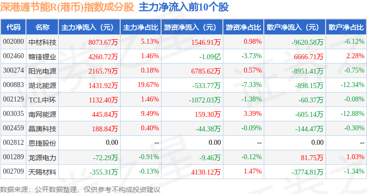 资金流向方面,深港通节能R(港币)(483086)指数成份股当日主力资金净流出合计28.8亿元,游资资金净流入合计5.78亿元,散户资金净流入合计23.02亿元。成份股资金流向详情见下表: