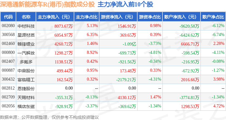 资金流向方面,深港通新能源车R(港币)(483088)指数成份股当日主力资金净流出合计37.85亿元,游资资金净流入合计6.59亿元,散户资金净流入合计31.27亿元。成份股资金流向详情见下表: