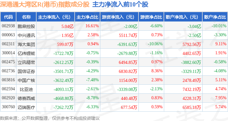 资金流向方面,深港通大湾区R(港币)(483090)指数成份股当日主力资金净流出合计14.11亿元,游资资金净流入合计4.01亿元,散户资金净流入合计10.1亿元。成份股资金流向详情见下表: